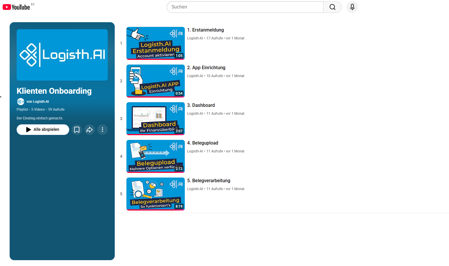 Sie werden anschließend zum privaten YouTube-Kanal von Logisth.AI weitergeleitet. Dort finden Sie zentrale Videos für den Einstieg sowie hilfreiche Erklärungen zu den wichtigsten Funktionen.