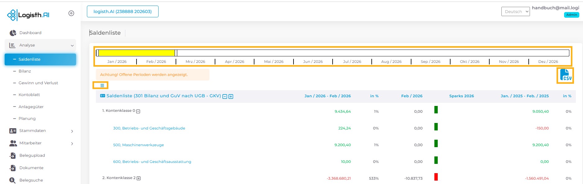 Die Saldenliste bietet einen umfassenden Überblick über die finanzielle Lage des Unternehmens. Sie zeigt die aktuellen Salden der verschiedenen Konten, inklusive Betrag und prozentualem Anteil im Verhältnis zum Gesamtkapital des Unternehmens.