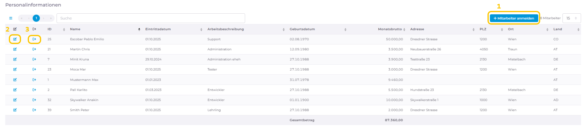 In dieser Übersicht werden alle aktiven Mitarbeiter angezeigt. Zusätzlich sind zu jeder Person Informationen wie Eintrittsdatum, Tätigkeitsbereich, Geburtsdatum, Gehaltsdaten sowie Adresse ersichtlich.