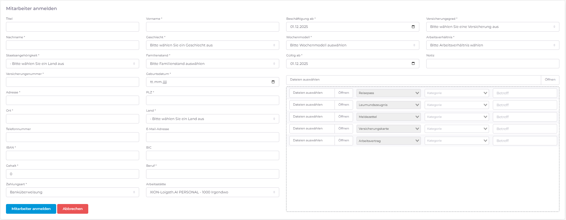 Um einen neuen Mitarbeiter anzulegen, müssen die folgenden Pflichtfelder in der entsprechenden Maske ausgefüllt werden. Diese Informationen sind notwendig, um den Mitarbeiter korrekt im System anmelden zu können.