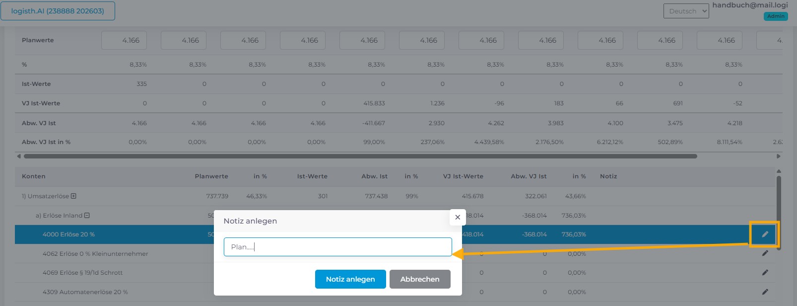 In der Tabelle 2 kann durch Anklicken des Bearbeitungssymbol (Stift) eine Notiz erstellt werden. Diese Notiz kann ebenfalls beim Exportieren von PDF- oder CSV-Dateien integriert werden,** um Ihre Notizen immer im Auge zu behalten.