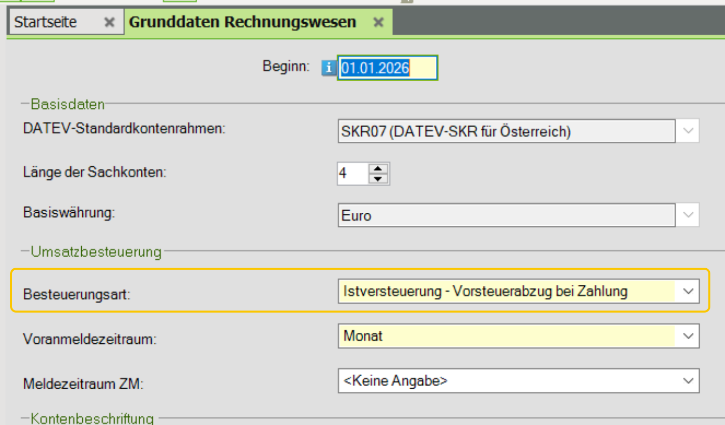 In Datev muss in den Mandantenstammdaten/Grunddaten Rechnungswesen die Besteuerungsart auf "Istversteuerung - Vorsteuerabzug bei Zahlung" hinterlegt sein.